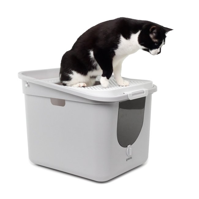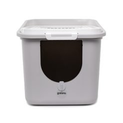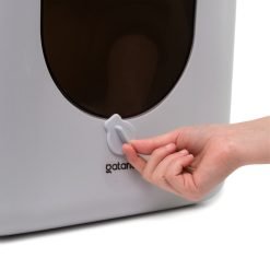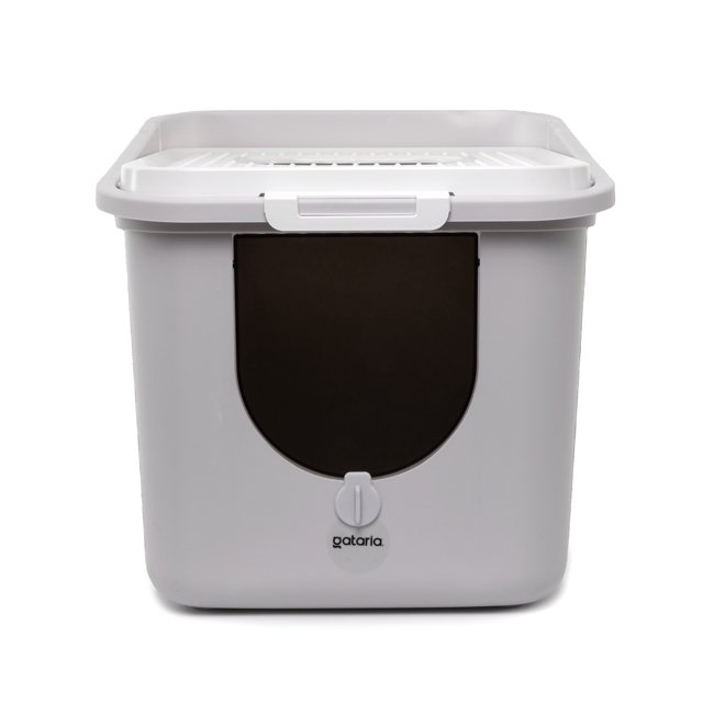 - Com a tranca frontal para cima: A porta frontal abre apenas para entrar (e não para sair) da caixa. Deste modo, o gato terá de sair por cima, fazendo com que os grãos de areia que leva nas patinhas voltem a cair no interior da caixa.