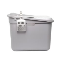 - Tampa perfurada: permite que qualquer areia agarrada às patas do gato, volte a cair no interior da caixa.