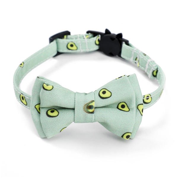 Uma coleira com laço amovível e padrão verde-pastel com abacates.