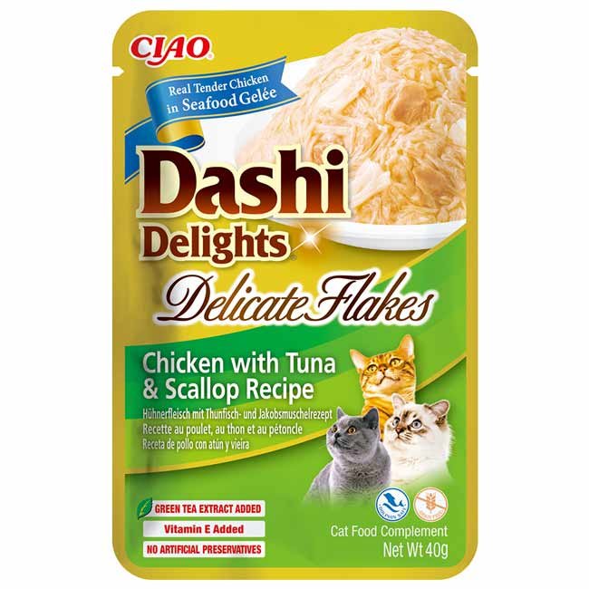 Dashi Delights Frango com Atum e Vieira é um alimento húmido complementar com pedaços saborosos mergulhados numa gelatina firme, uma combinação pensada para gatos exigentes.