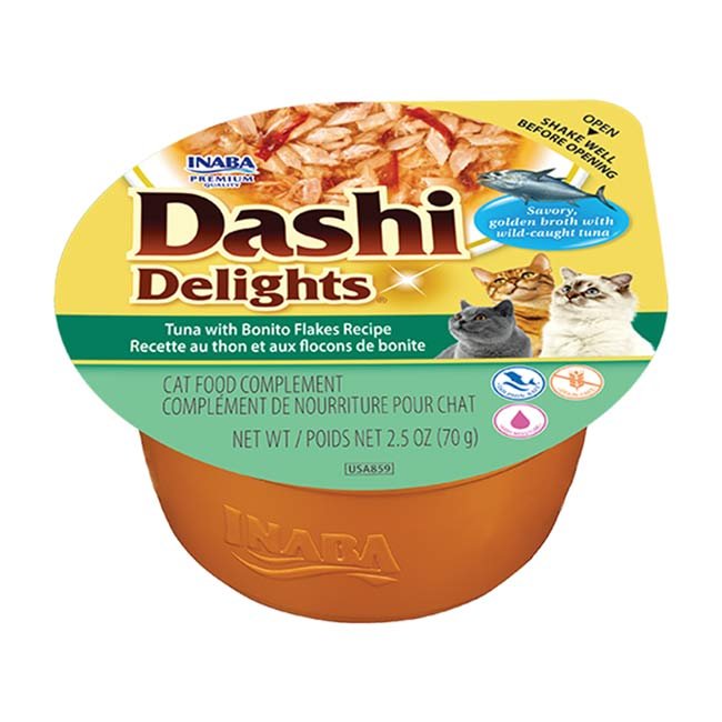 O Dashi Delights de Atum com Peixe Bonito é um alimento húmido complementar num caldo leve e nutritivo. Fornece hidratação, sabor e proteínas de alta qualidade num só prato.