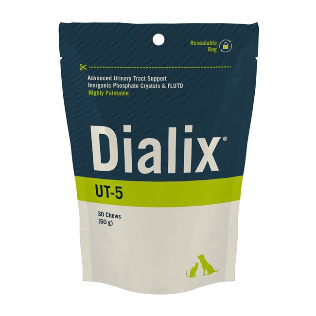 O Dialix UT-5 é um alimento complementar dietético para gatos indicado no tratamento de problemas do trato urinário inferior, reduzindo a probabilidade de reincidência em casos crónicos. É altamente palatável e de fácil administração.