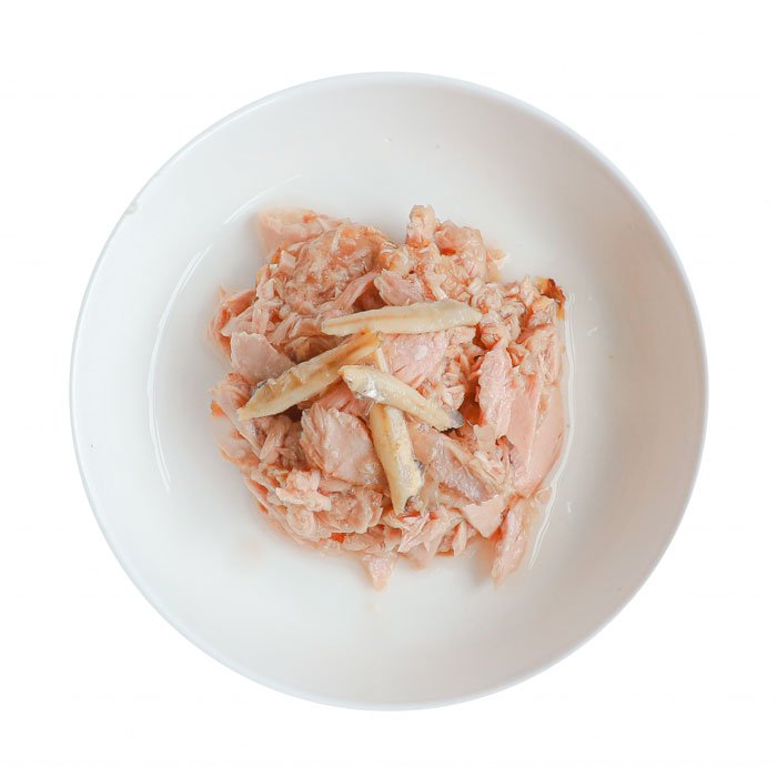 COMPOSIÇÃO: Atum fresco desossado (38,18 %), anchovas (3,75 %), extrato de atum (3 %), frutooligossacarídeos (60 mg/kg), cloreto de potássio.