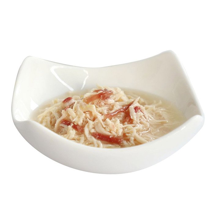 COMPOSIÇÃO: Frango fresco desossado (38,57 %), Vitela (2,86 %), amido de tapioca (1,94 %) Frutooligossacarídeos (120 mg/kg).