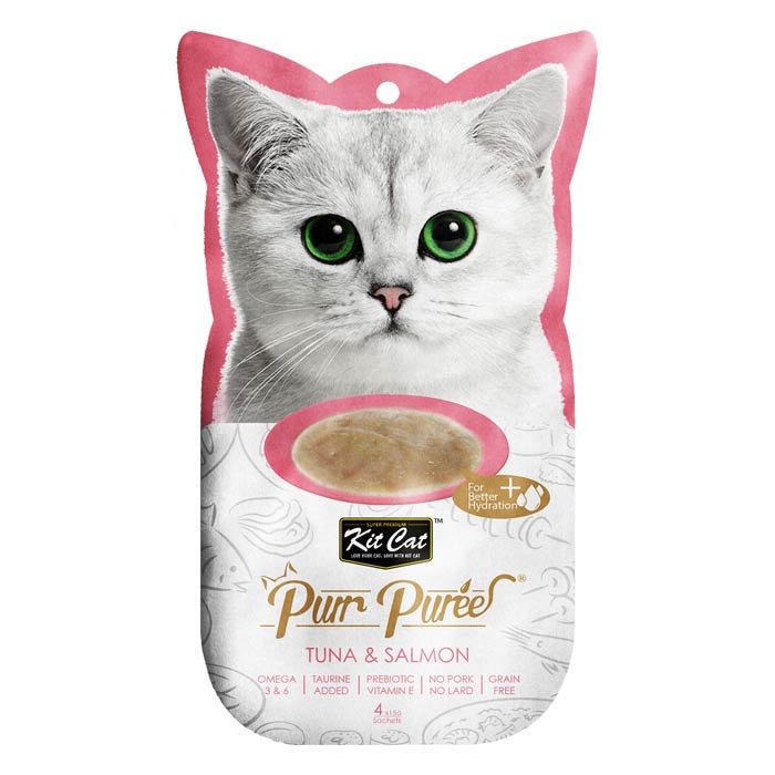 Kit Cat Purr Purée com Atum e Salmão é um snack semi-líquido, cremoso e funcional, ideal para recompensar o gato e complementar a sua dieta.