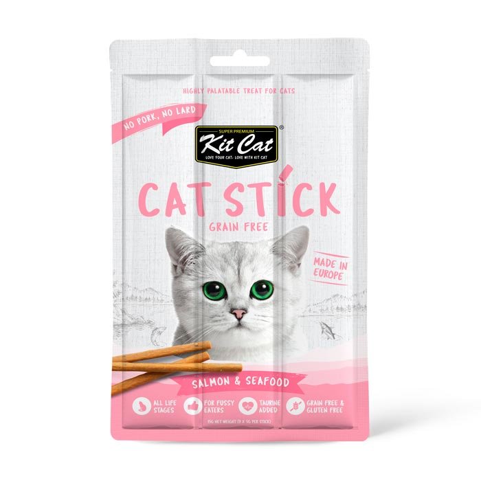 Kit Cat Stick com Salmão e Frutos do Mar é um snack semi-húmido, ideal para complementar a dieta do seu gato. Esta gama de produtos também é ideal para ensinar novos truques e reforçar comportamentos positivos.