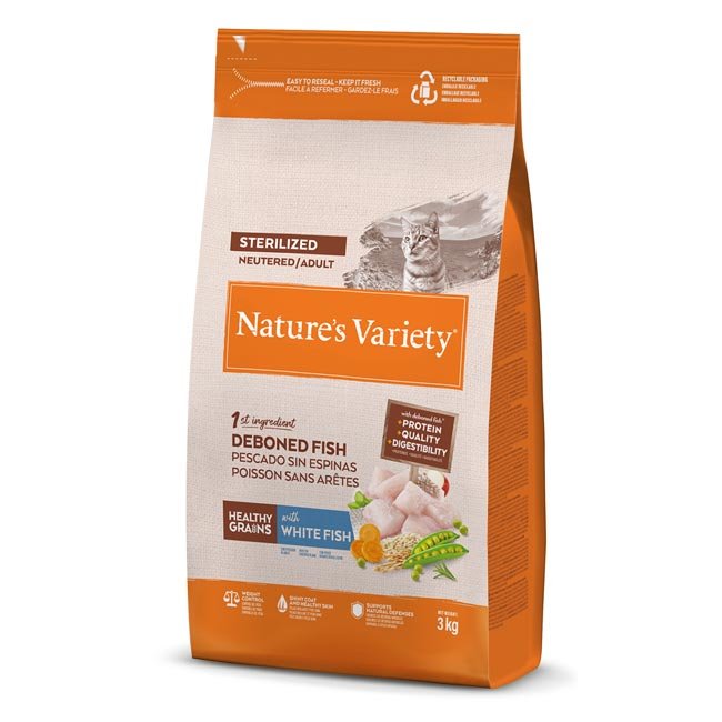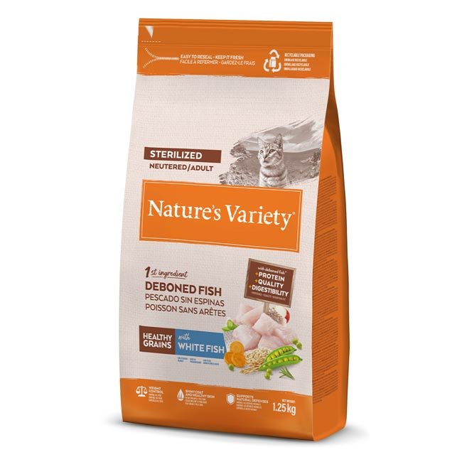 Nature’s Variety Healthy Grains com Peixe branco é um alimento completo e equilibrado para gatos esterilizados. Elaborado com peixe branco sem espinhas como ingrediente principal. Complementado com frutas, vegetais cuidadosamente selecionados e cereais