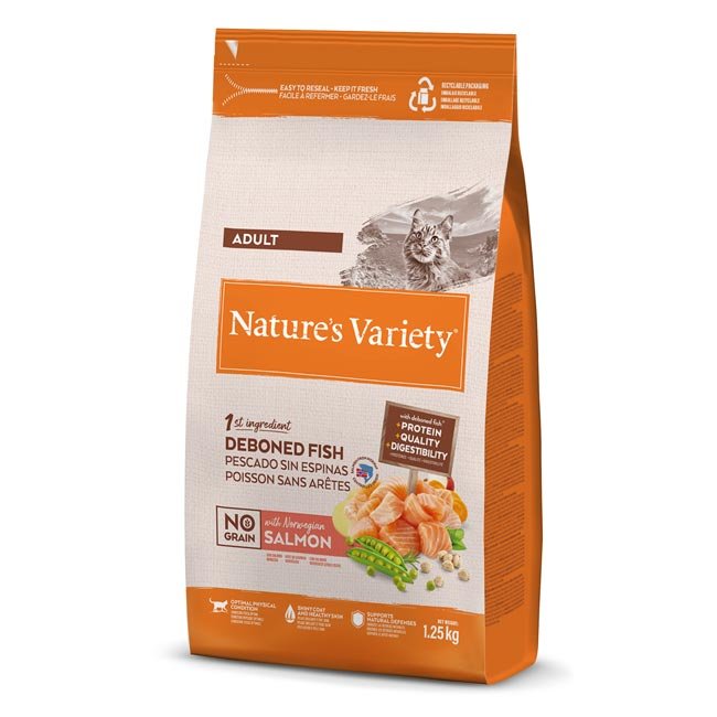 Nature’s Variety No Grains com Salmão é um alimento completo e equilibrado para gatos adultos, sem cereais. Elaborado com salmão da noruega sem espinhas como ingrediente principal e complementado com frutas e vegetais cuidadosamente selecionados.