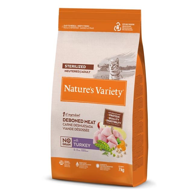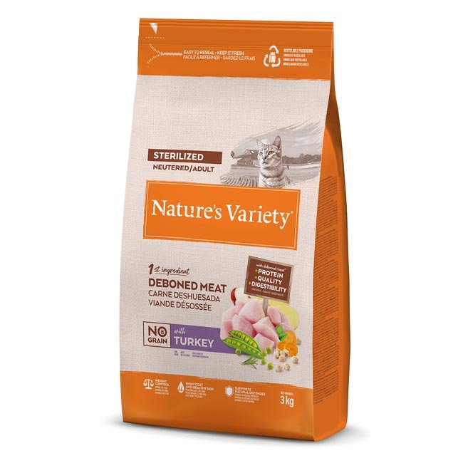 Nature’s Variety No Grains com Peru é um alimento completo e equilibrado sem cereais, para gatos adultos esterilizados. Elaborado com carne de peru desossada como ingrediente principal, complementado com frutas e vegetais cuidadosamente selecionados.