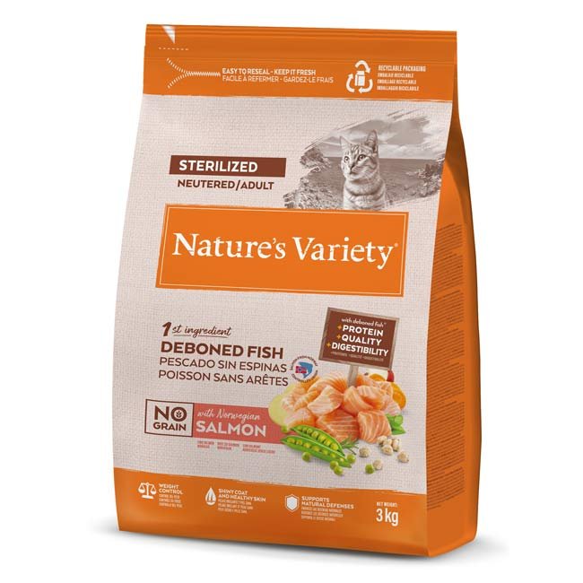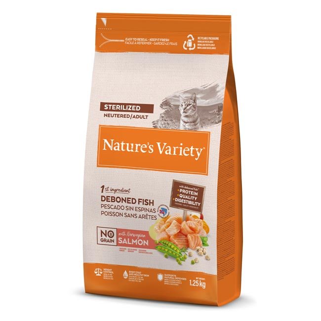 Nature’s Variety No Grains com Salmão é um alimento completo e equilibrado para gatos adultos esterilizados. Elaborado com salmão da noruega sem espinhas como ingrediente principal e complementado com frutas e vegetais cuidadosamente selecionados.