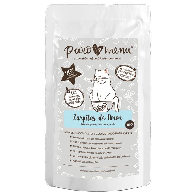 Puromenu Patinhas de Amor com Ganso é uma refeição húmida completa, equilibrada e natural, ideal para gatos de todas as idades. Com uma textura suave em patê e ingredientes de alta qualidade, oferece uma nutrição adaptada às necessidades de um felino carnívoro.