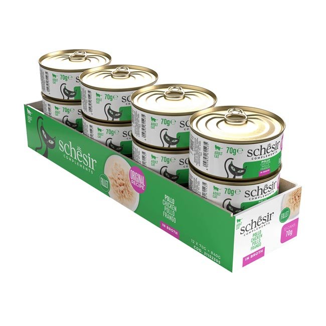 A receita é feita com deliciosos e autênticos filetes de frango. Apresenta-se no próprio líquido de cozimento para os gatos que apreciam o sabor natural e uma consistência mais fluída.