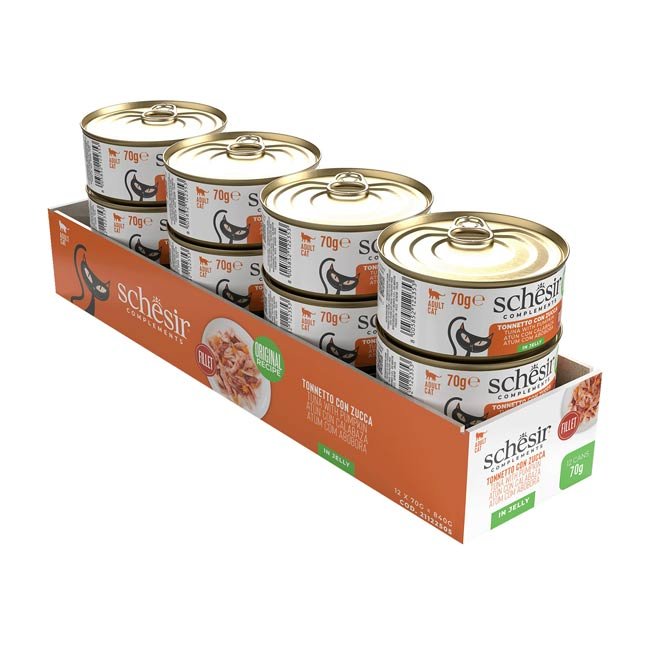 Com uma mistura original de filetes de atum suculentos e abóbora, esta receita oferece uma refeição saborosa e equilibrada. Servida em gelatina firme, é ideal para gatos que adoram novas texturas e sabores.
