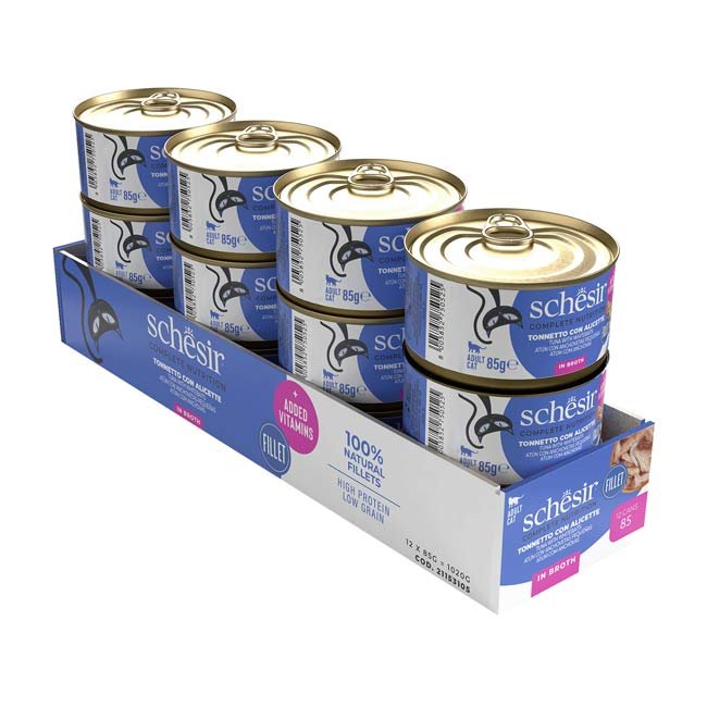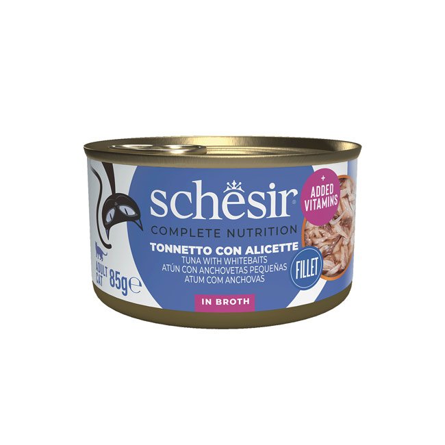 Schesir Complete Nutrition de Atum com Anchovas com textura em caldo é um alimento húmido completo que oferece sabor e nutrição numa única refeição. Esta fórmula inclui pedaços suculentos de atum com anchovas imersos num caldo leve e apetitoso, ideal para gatos que apreciam receitas sofisticadas e uma consistência mais líquida.
