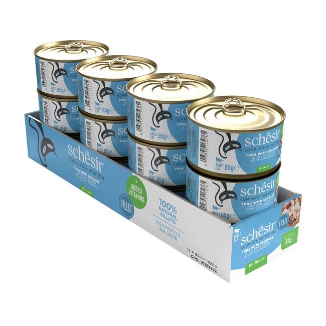 Schesir Complete Nutrition de Atum com Robalo em gelatina combina suculentos filetes de atum com robalo, um peixe reconhecido pelo seu sabor único. Apresentada em gelatina, é perfeita para gatos que preferem uma textura mais sólida e sabores autênticos do mar.