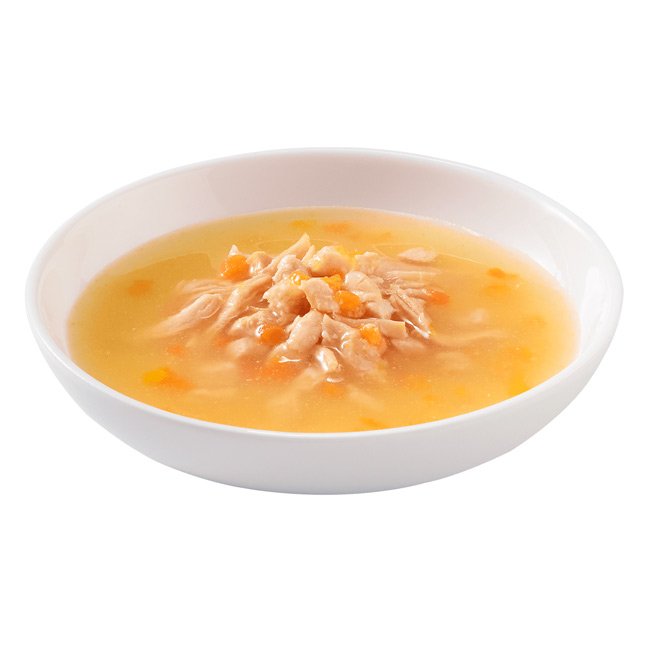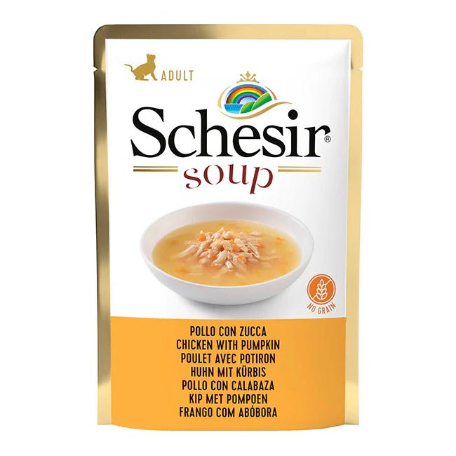 Schesir Soup de Frango e Abóbora combina frango cuidadosamente preparado com abóbora numa textura suave de sopa. Ideal para gatos que adoram refeições húmidas e apreciam o líquido do alimento.